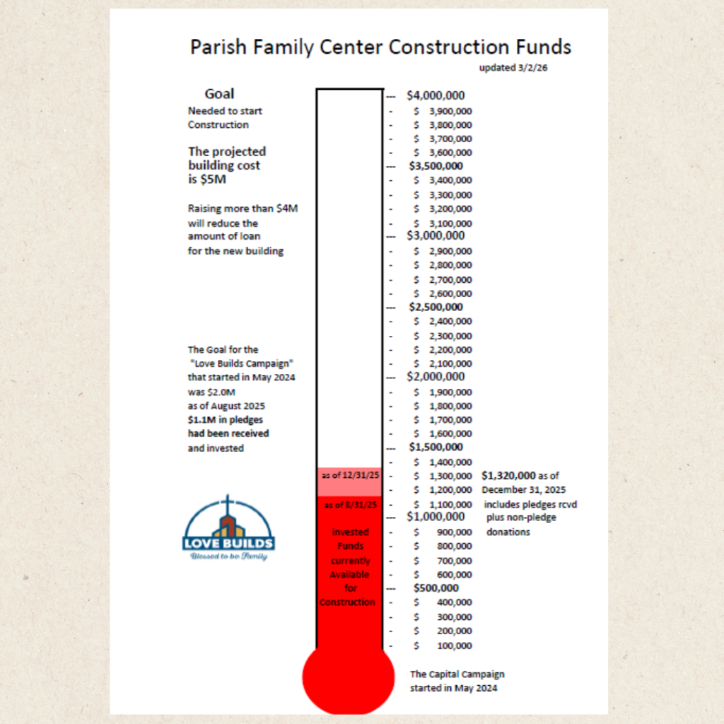 Click HERE to give to our Love Builds, Capital Campaign in our effort to build a Parish Family Center.